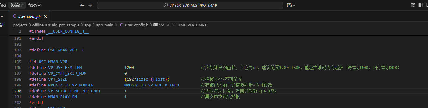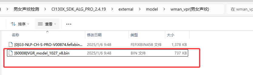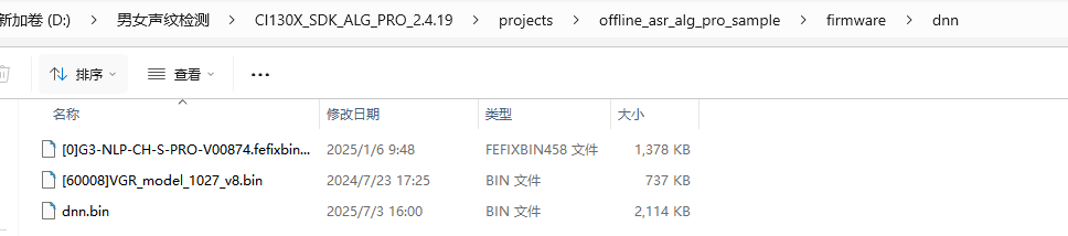 (1)首先把CI130X_SDK_ALG_PRO_2.X.X\external\model\wman_vpr(男女声纹)下的[60008]VGR_model_1027_v8.bin文件(男女声纹模型)(图1所示)复制到工程目录下的firmware目录下的dnn目录下面(图2所示)。