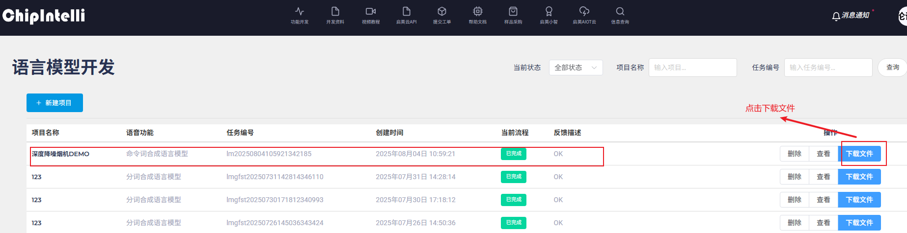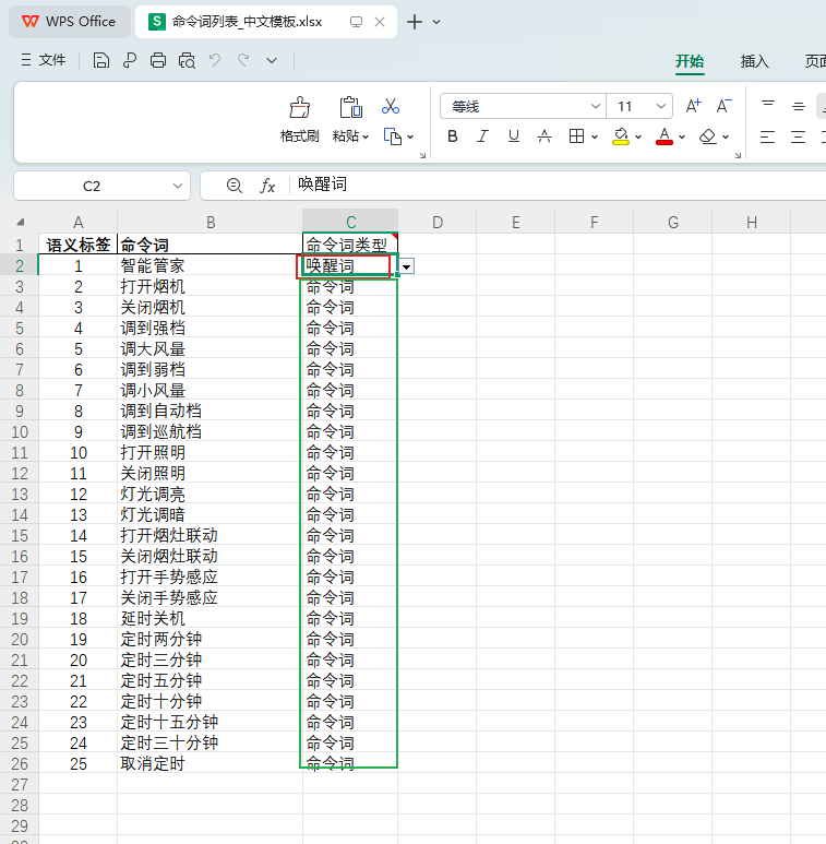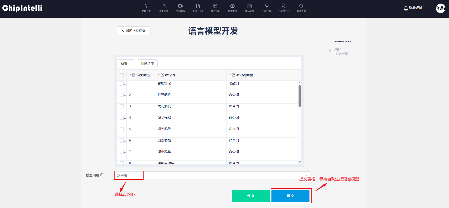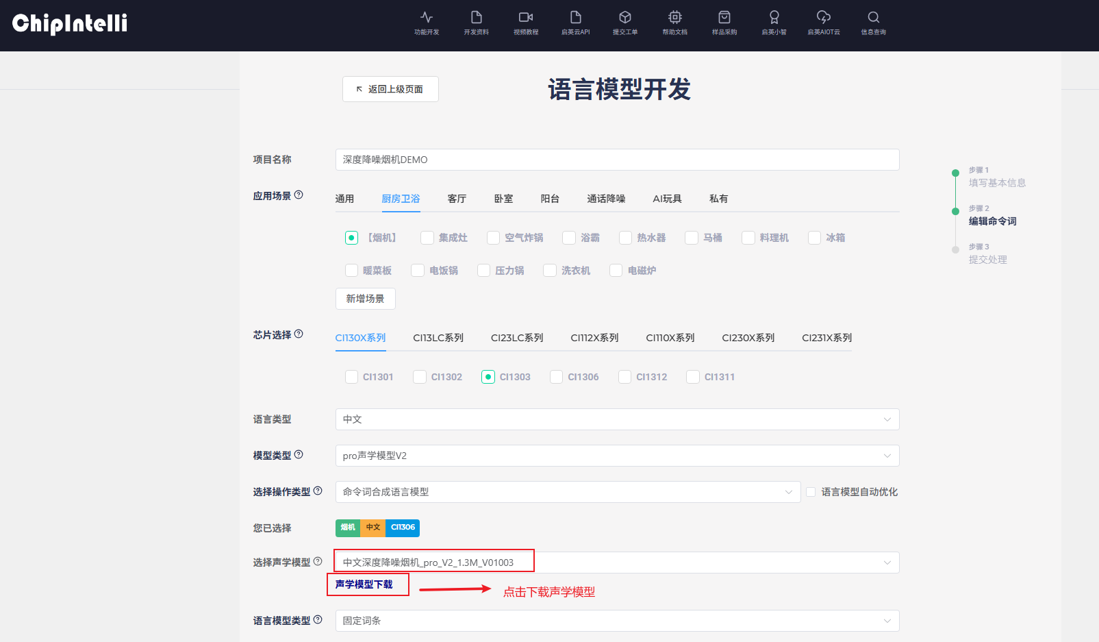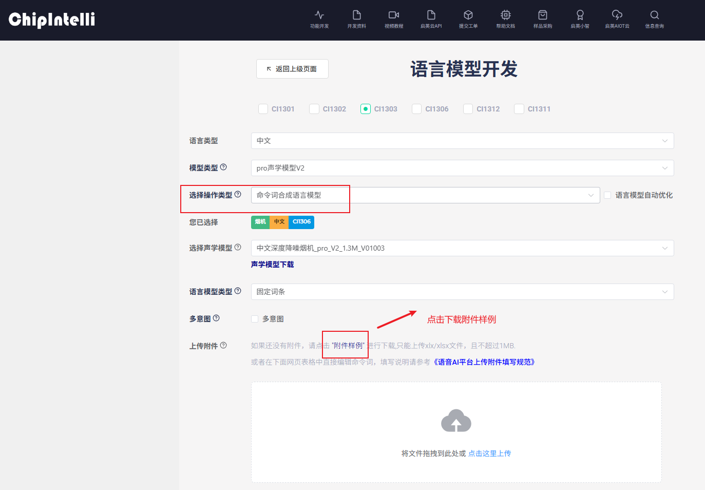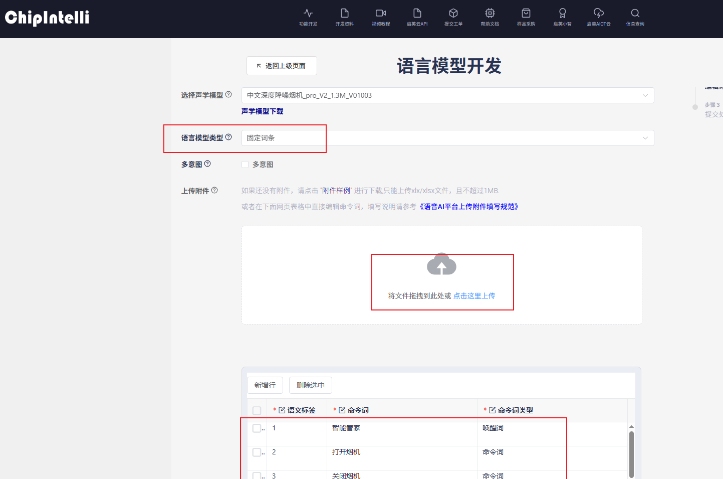 1、选择命令词合成语言模型,下载命令词样例表格;