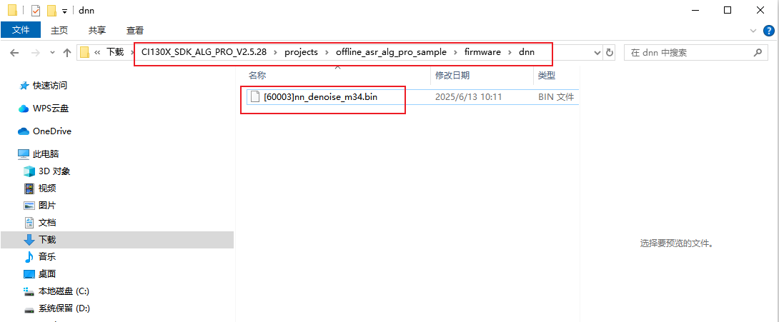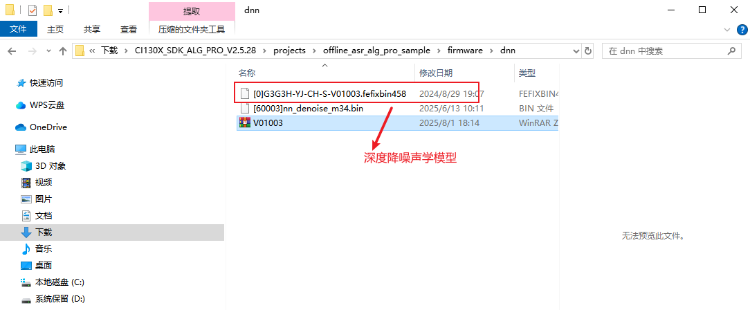 5、复制深度降噪声学模型压缩包并解压到CI130X_SDK_ALG_PRO_Vx.x.x\projects\offline_asr_alg_pro_sample\firmware\dnn文件夹中;
