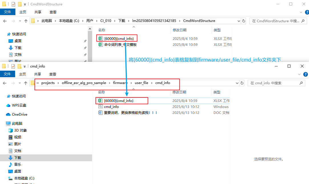 5、将[60000]{cmd_info}表格复制到CI130X_SDK_ALG_PRO_Vx.x.x\projects\offline_asr_alg_pro_sample\firmware\user_file\cmd_info文件夹下;