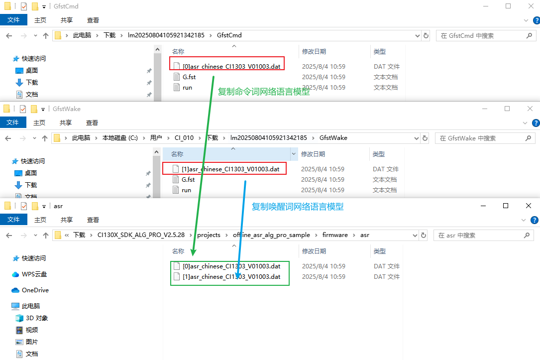 6、将命令词和唤醒词网络语言模型复制到CI130X_SDK_ALG_PRO_Vx.x.x\projects\offline_asr_alg_pro_sample\firmware\asr文件夹下;