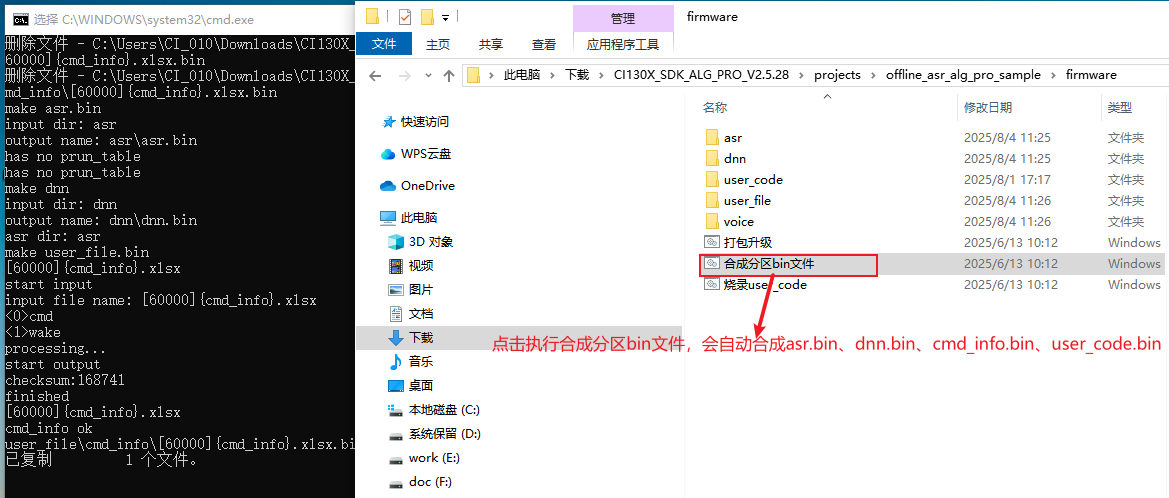 1、点击合成分区bin文件,会自动合成asr.bin、dnn.bin、cmd_info.bin、voice.bin、user_code.bin;