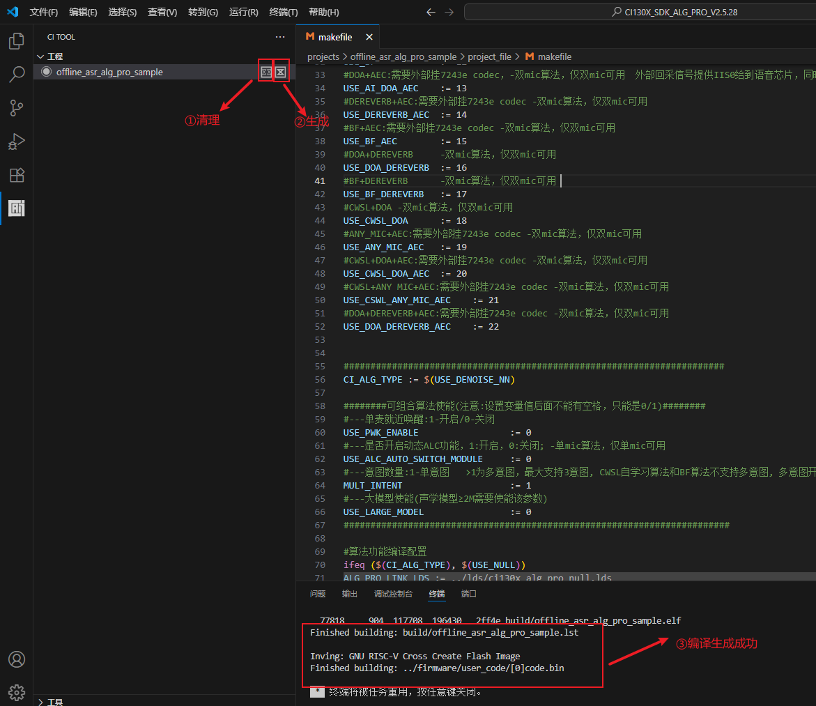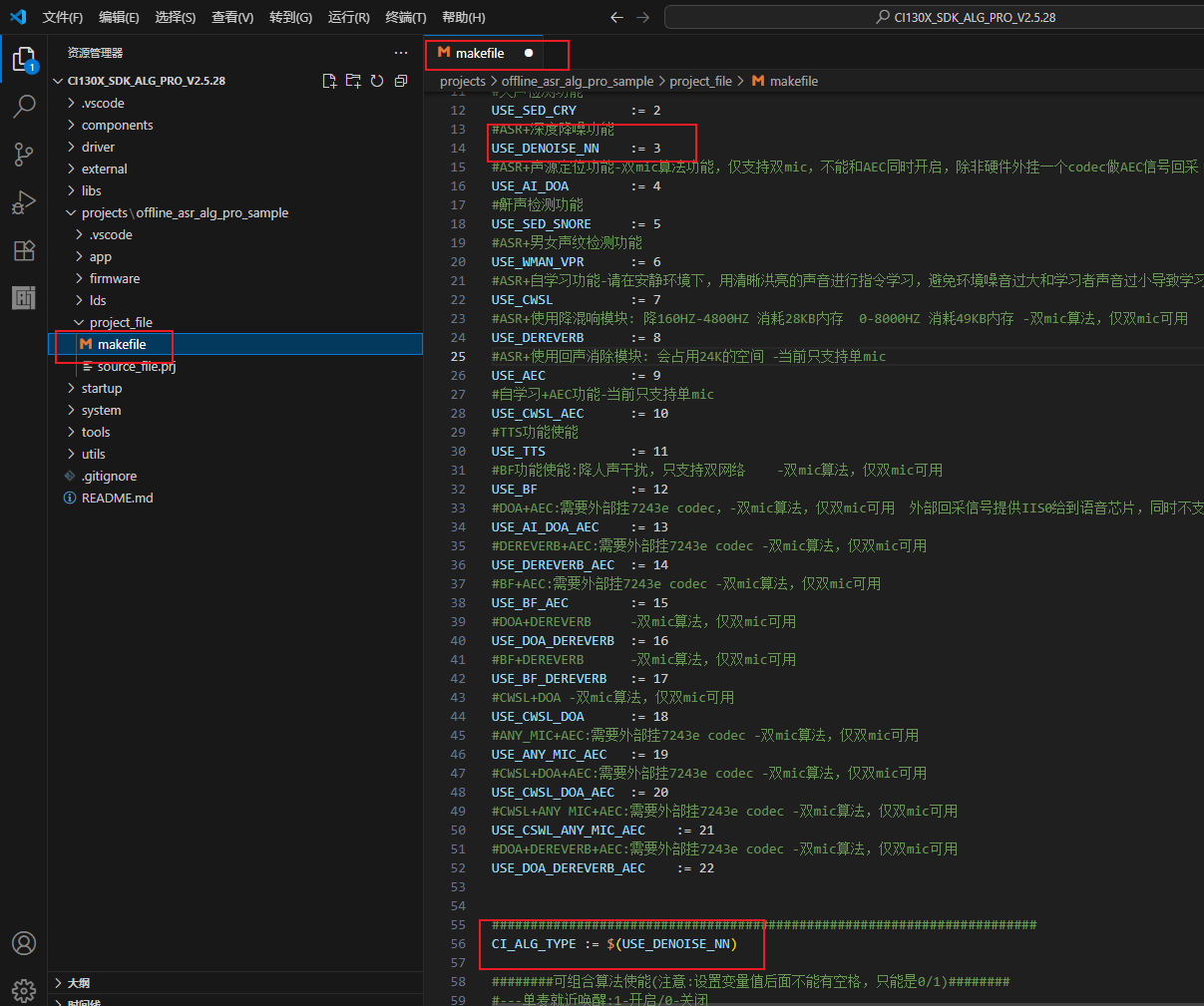 打开CI130X_SDK_ALG_PRO_Vx.x.x\projects\offline_asr_alg_pro_sample\project_file\makefile 文件,将CI_ALG_TYPE 修改为 CI_ALG_TYPE := $(USE_DENOISE_NN)