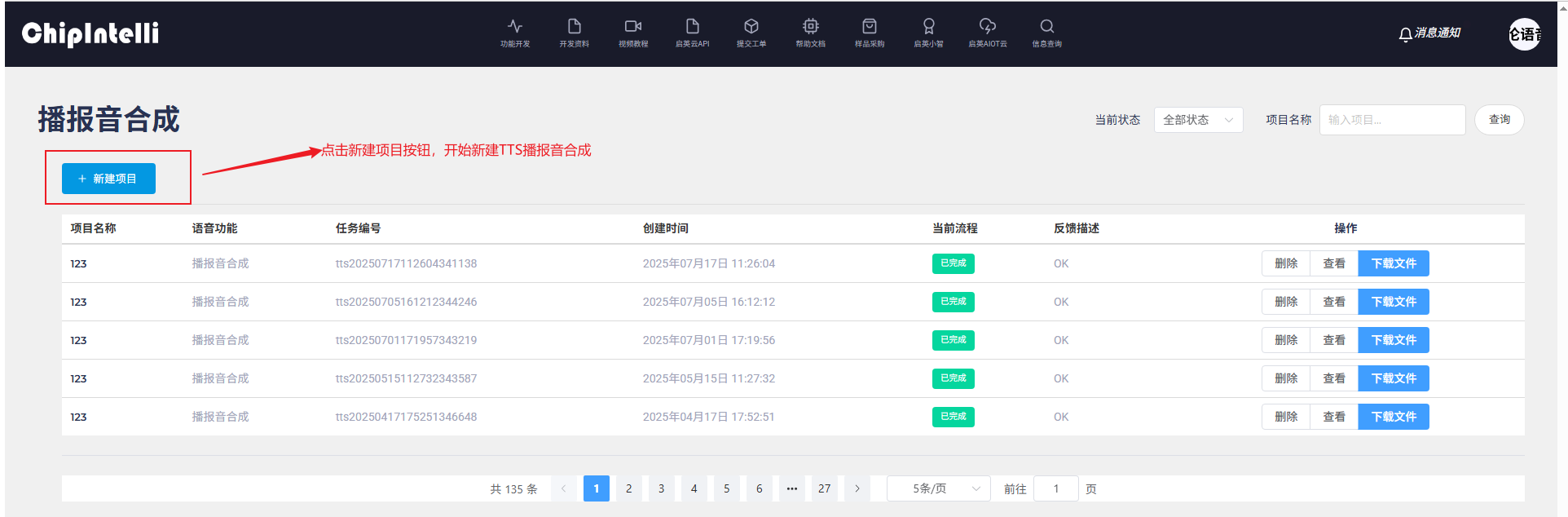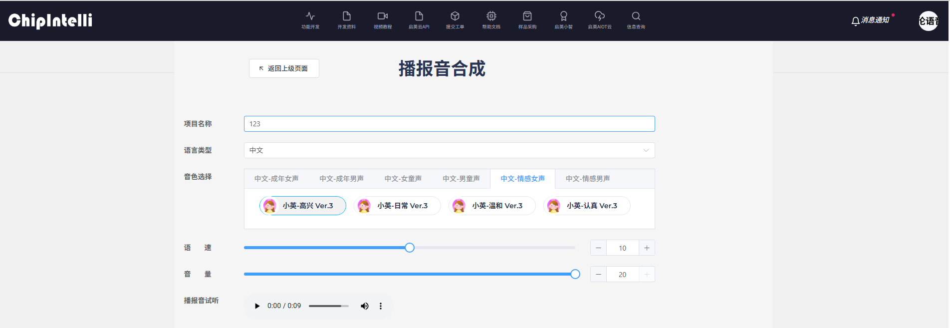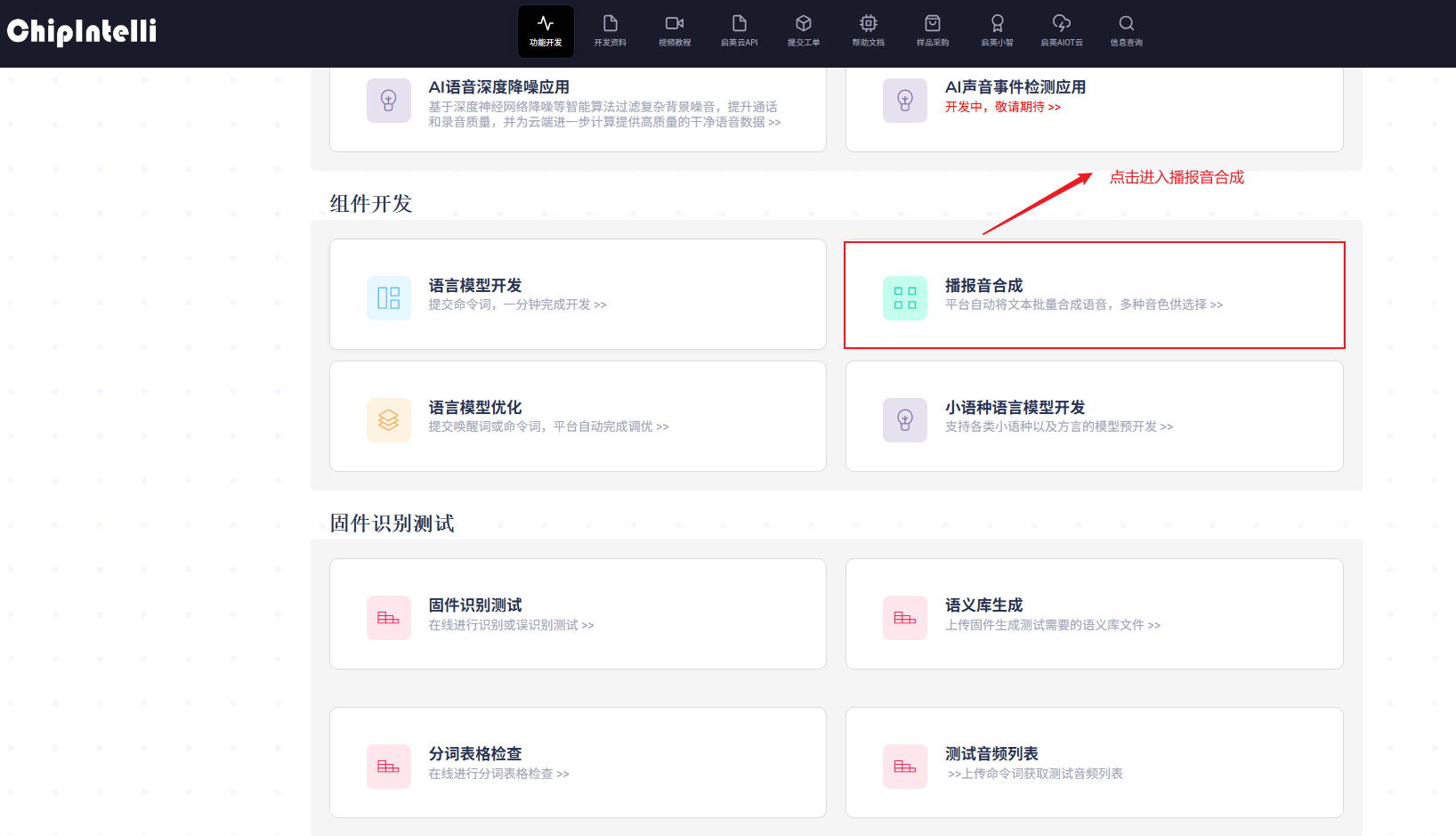 1、功能开发主页选择播报音合成;