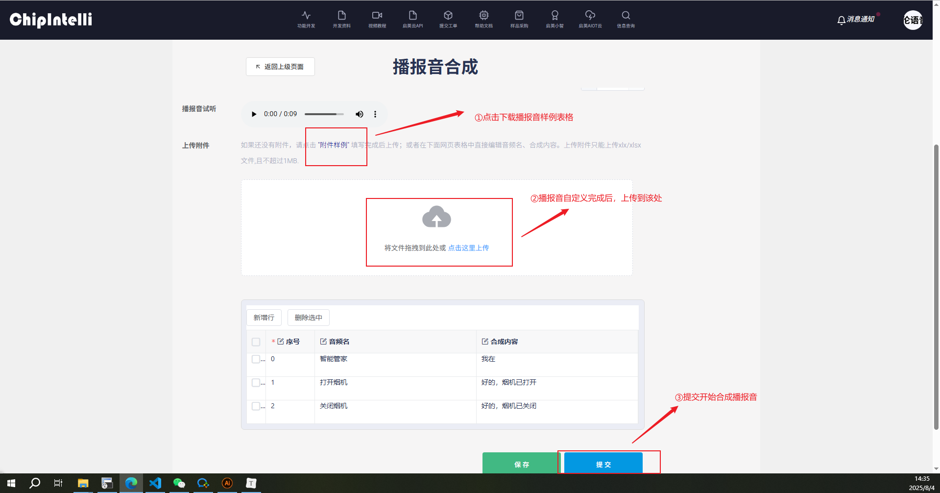 4、下载播报音样例表格,自定义播报内容,提交开始合成播报音;