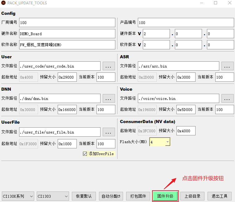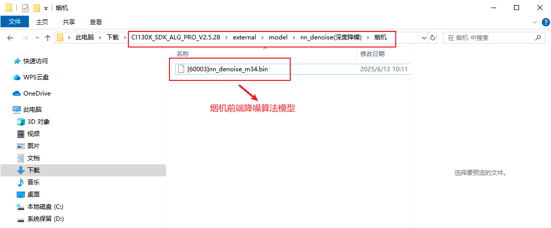 使用深度神经网络降噪算法时需要将CI130X_SDK_ALG_PRO_Vx.x.x\external\model\nn_denoise(深度降噪)\烟机\ [60003]nn_denoise_m34.bin 前端降噪算法模型,复制到CI130X_SDK_ALG_PRO_Vx.x.x\projects\offline_asr_alg_pro_sample\firmware\dnn文件夹中。