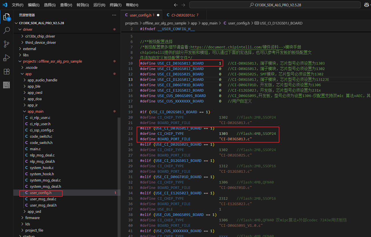 打开CI130X_SDK_ALG_PRO_Vx.x.x\projects\offline_asr_alg_pro_sample\app\app_main\user_config.h文件,手动新增CI-D03GS01J模块对应的板级配置文件。