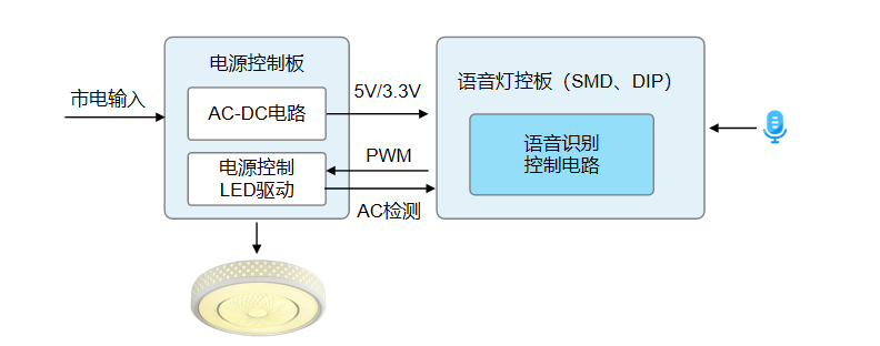 将语音模块内置,和灯驱部分连在一起。通过语音模块输出PWM信号控制灯光输出;语音模块检测AC信号,实现墙壁开关变光功能。