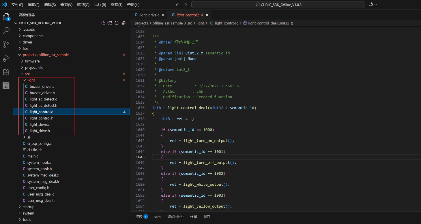 3、灯光控制处理函数路径:CI13LC_SDK_Offline_Vx.x.x\projects\offline_asr_sample\src\light\light_control.c