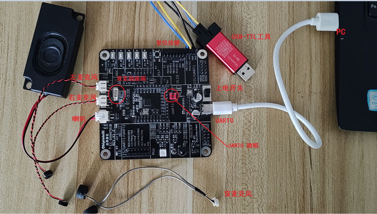 (1)串口使用说明:管脚不与其他功能冲突的前提下,UART0,UART1,UART2,均可以配置成日志打印口或者通讯口;烧录升级固件只能采用UART0。图中UART0通过板载CH340,转换成USB 直接与PC端相连;USB-TTL工具通过杜邦线连接UART1,芯片TX1接工具RX,芯片RX1接TX。