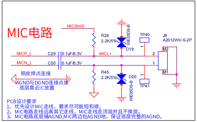 差分线路(推荐),麦克的”+”接语音芯片的MICP_L,麦克的”-“接语音芯片的MICP_N,在语音芯片内进行差分运算,可以消除常见的一些共模干扰(例如一个信号干扰到麦克”+”和”-“,差分运算后就将该干扰信号消除了),此线路+双绞线麦克,可以解决绝大部分的通用外部干扰