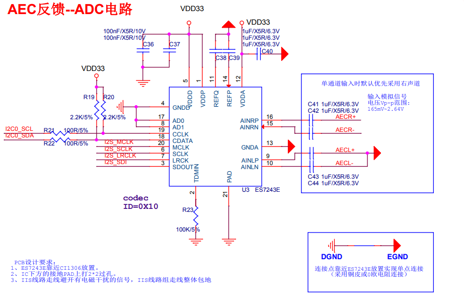 双麦工程中使用回声消除算法,若配置了其他任意双麦算法,需外置codec,本方案选用立体声音频ADC芯片ES7243E进行设计,参考电路如下图: