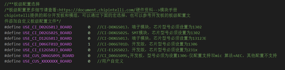 本文档示例采用CI-D06GT01D 开发板,需要在..\projects\offline_asr_alg_pro_sample\app\app_main\user_config.h中修改板级配置如下: