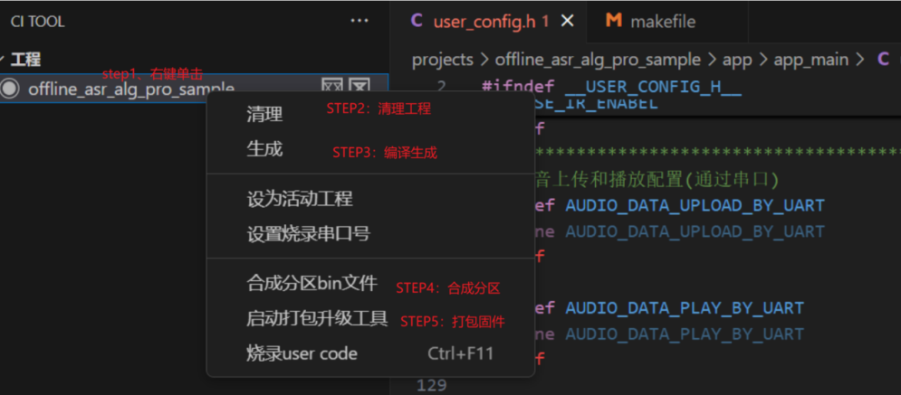 2、修改配置完成后,在VScode中按如下操作进行代码编译和和合成分区文件 :