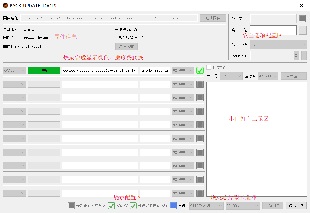 4、打包固件成功后,将硬件串口接到PC后,再给 开发板进行供电;下图为固件升级成功的界面;更多细节☞请查看文档中心链接