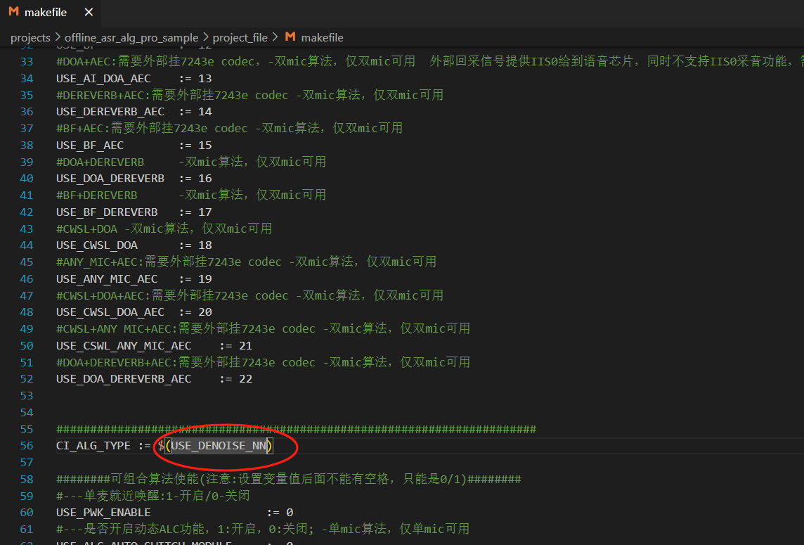 1、打开offline_asr_alg_pro_sample\project_file\makefile文件,对CI_ALG_TYPE修改为CI_ALG_TYPE := $(USE_DENOISE_NN)