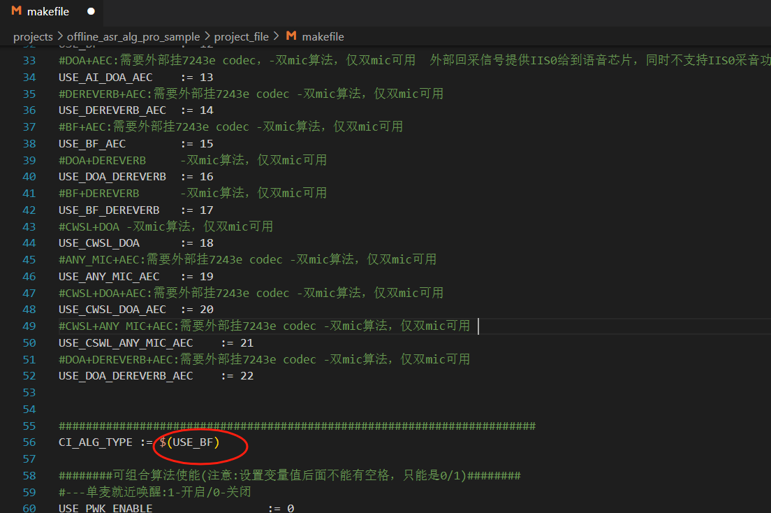 1、打开offline_asr_alg_pro_sample\project_file\makefile文件,对CI_ALG_TYPE修改为CI_ALG_TYPE := $(USE_BF)
