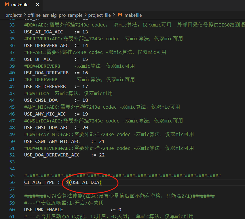 1、打开offline_asr_alg_pro_sample\project_file\makefile文件,对CI_ALG_TYPE修改为CI_ALG_TYPE := $(USE_AI_DOA)