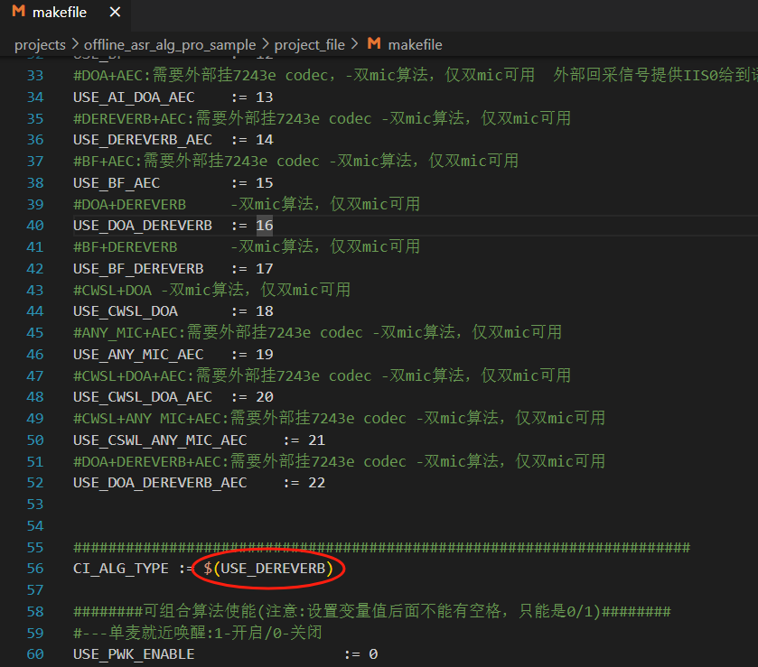 1、打开offline_asr_alg_pro_sample\project_file\makefile文件,对CI_ALG_TYPE修改为CI_ALG_TYPE := $(USE_DEREVERB)