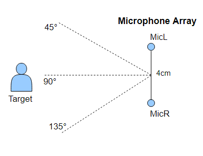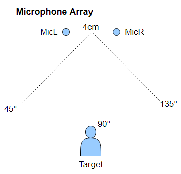 该方案应用场景示意图如下图所示。图a,b中麦克风阵列为线性双麦阵列,推荐麦间距为4cm。设置角度从左麦克到右麦克为0度到180度变化,利用DOA算法可以获取目标人声的方位角度。