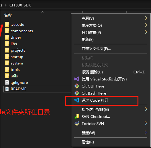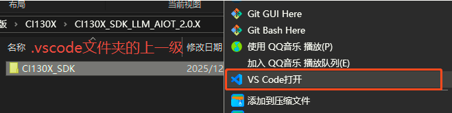 方法二:选中CI130X_SDK文件夹(.vscode文件夹的上一级),右键“通过Code打开”: