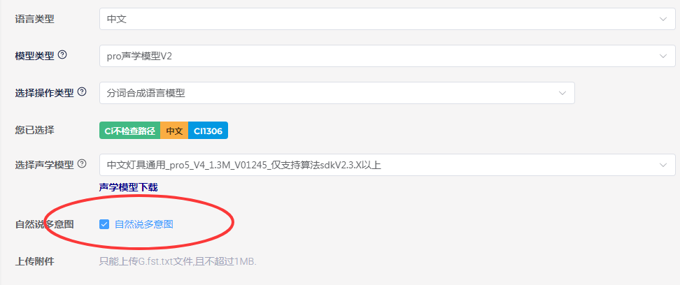 上传语音AI平台 制作语言模型,选择好对应的dnn后,自然说多意图复选框要勾选上,如图: