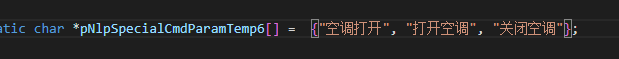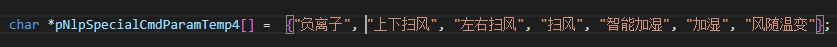 b. 数组 pNlpSpecialCmdParamTemp4 用于有关闭属性,且也可以单独说的命令词,如指令词”负离子”,它有关闭属性,可以说指令”关闭负离子”,需要注意存在包含关系的命令词,被包含的词放在包含词的后面,例如: