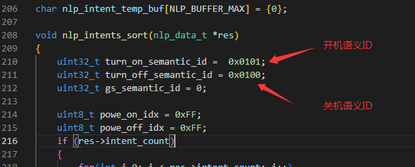 a,针对多意图输出到协议有排序的情况,如对”开机”、”关机”类命令词做排序的情况,需要在文件 projects/offline_asr_alg_pro_sample/app/app_main/ci_nlp_user.c 中找到函数nlp_intents_sort(), 注明”开机”、”关机”类命令词的语义ID,如图: