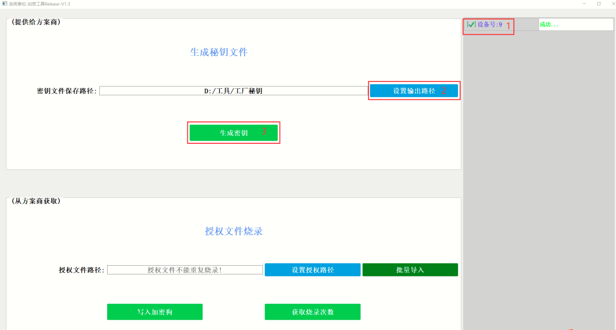 选中加密狗->设置输出路径->点击生成密钥(可生成多次直至写入加密狗),显示”成功”后,将在输出路径中生成加密狗对应.key密钥文件。