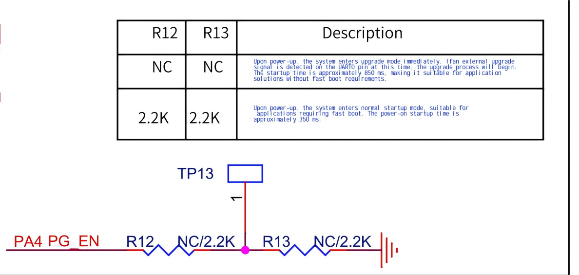 - For fast boot-up, a pull-down resistor must be added to the PA4 (PIN8) of the chip in the hardware design. Without this, the power-up time will be significantly longer, as shown in the diagram below: