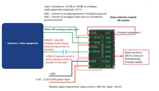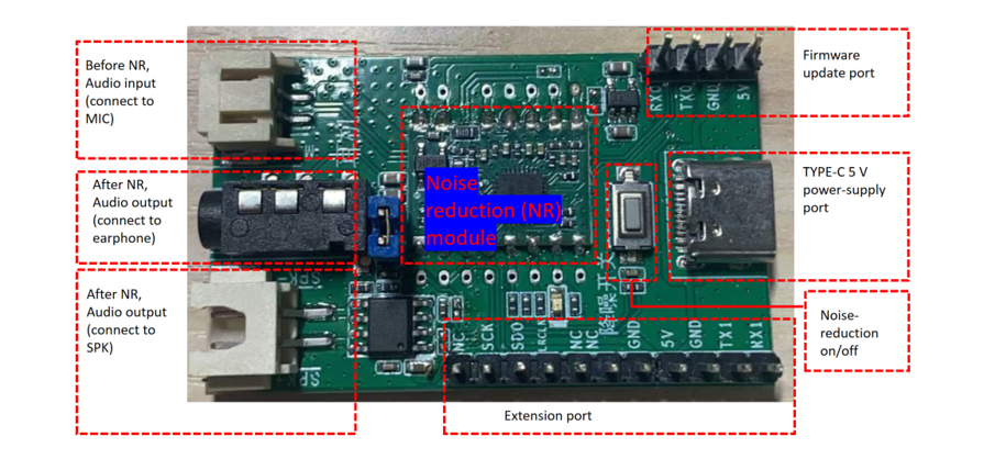 By default, it supports analog audio input and outputs noise-reduced analog audio. It also supports UART and I2S audio transmission. For custom requirements, please contact our business team through the official website. Chipintelli Business Contact
