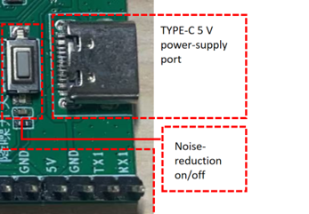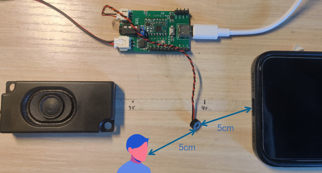 Connect the 5V power supply (Type-C interface) and attach a speaker or headphones. Place the speaker close to your ear. For optimal noise reduction demonstration, position the noise source 5cm from the MIC and the speaker 5cm from the MIC.