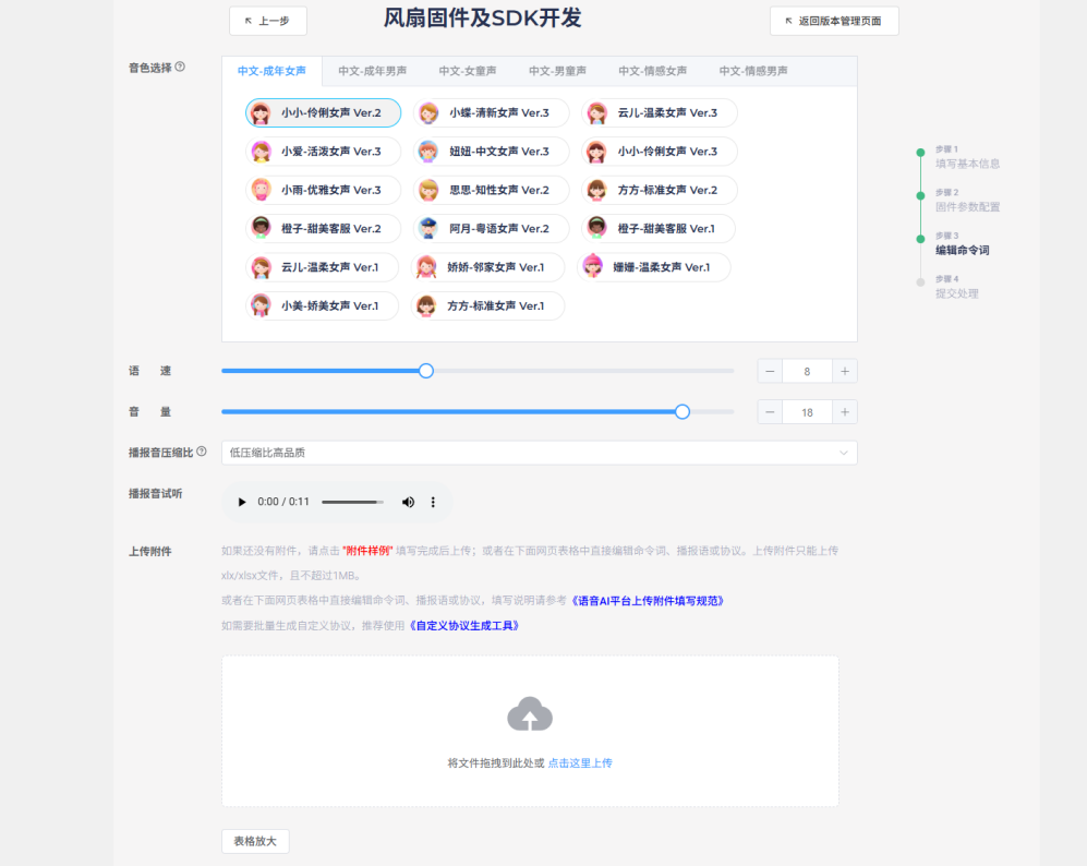 Modify the voice characteristics, speech rate, and volume of the broadcast sound as desired. For compression ratio, prioritize lower compression for higher sound quality. Click “Download Example” to get the command word table.