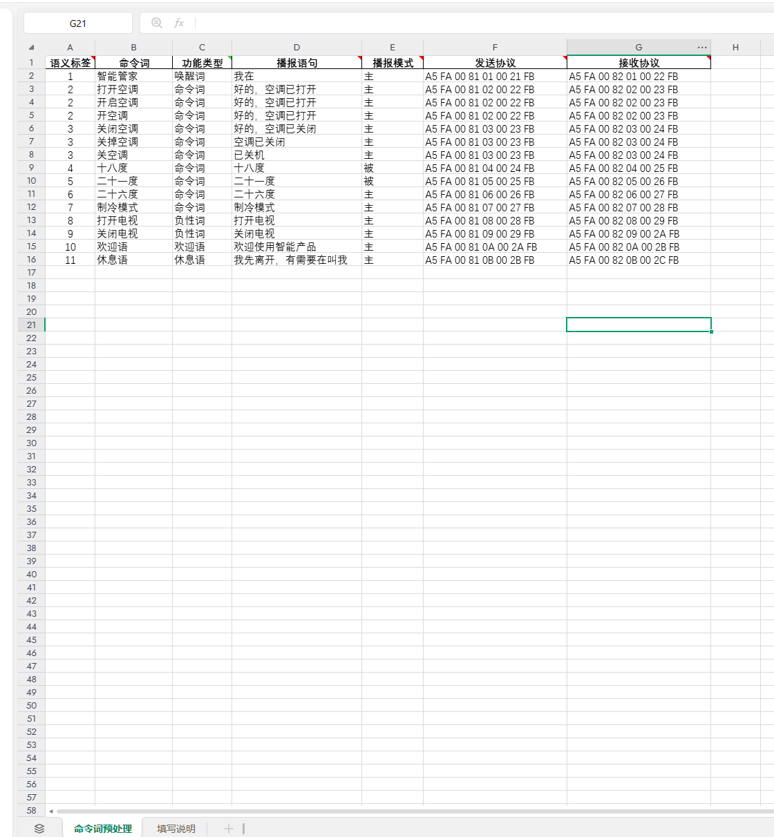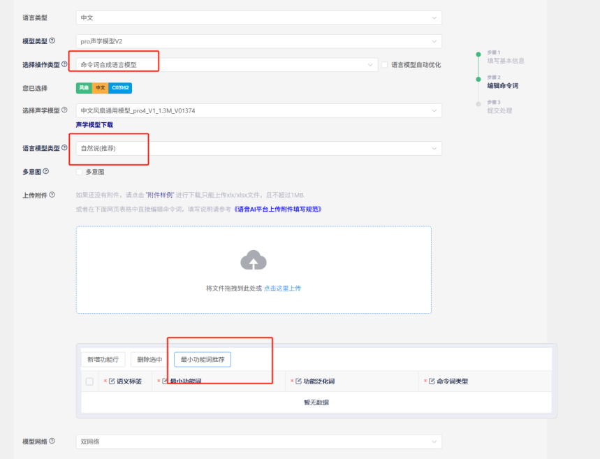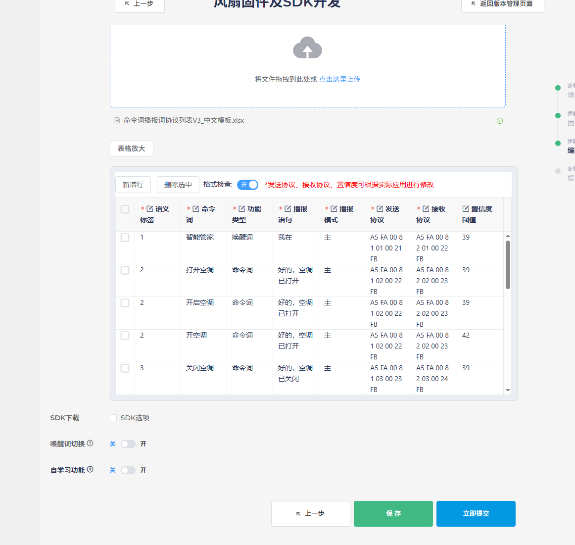 After filling out the table, click “Upload” in the creation interface to load the table. Note that Chinese command words should not contain English words, spaces, or punctuation marks, as this will cause format validation to fail, preventing firmware generation.