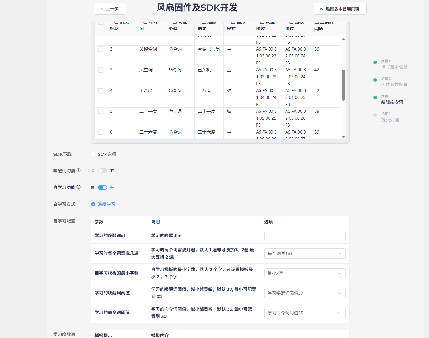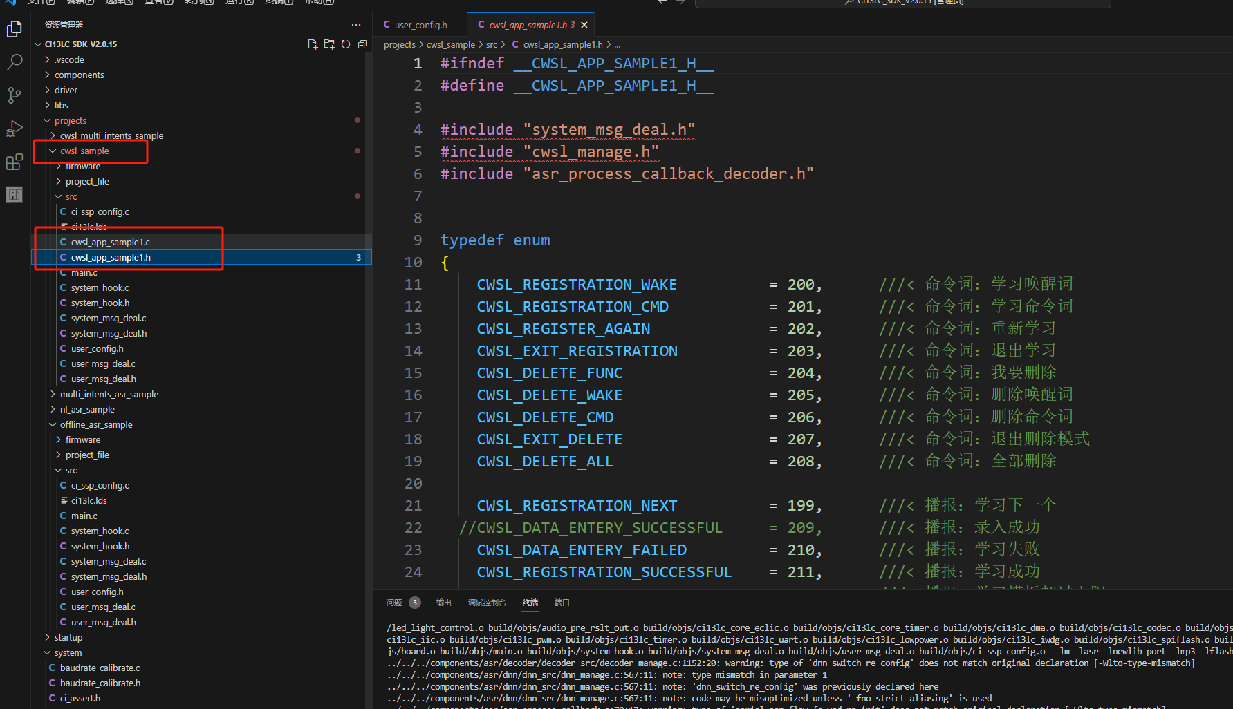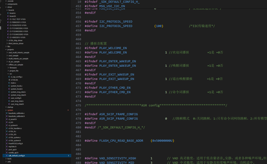 For self-learning development, it’s recommended to enable the self-learning feature at the end of section 4.1’s platform-based firmware creation. Simply fill in the content as prompted to generate the corresponding functionality. The main control and modification parts in the SDK program are located in projects\cwsl_sample\src\cwsl_app_sample1.c and cwsl_app_sample1.h. For detailed development documentation, see: Offline Commands Self-Learning Quick Start