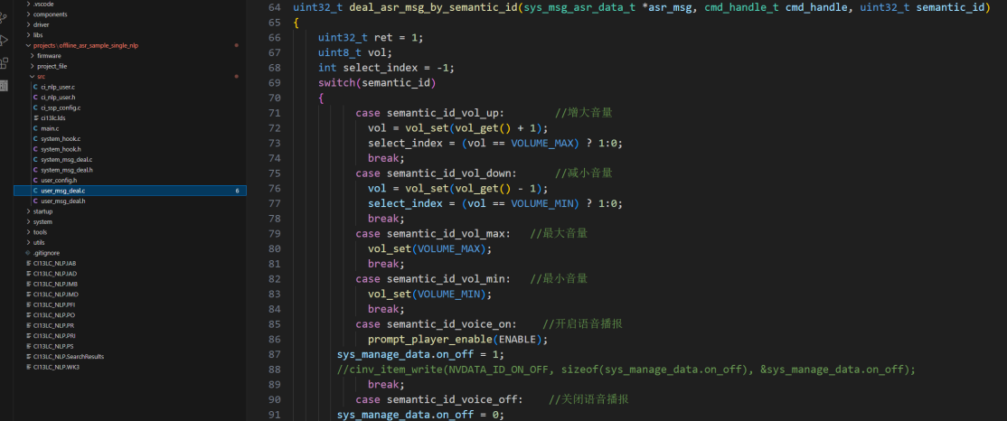 Configure volume control and other functions in the deal_asr_msg_by_cmd_id or deal_asr_msg_by_semantic_id functions.