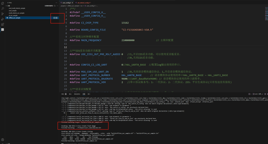 Generally, the program modifications only include: UART communication protocol, command word ID or semantic ID judgment processing, chip version, and other basic macro definitions. These contents have been integrated into the “Offline Speech Recognition Large Model Application” of the Chipintelli AI Speech Development Platform, allowing settings through forms, values, and switches to automatically generate corresponding firmware and modifiable SDK. The following illustrates two methods: how to use the platform to create basic firmware and how to synthesize firmware using the SDK and command word tables.
