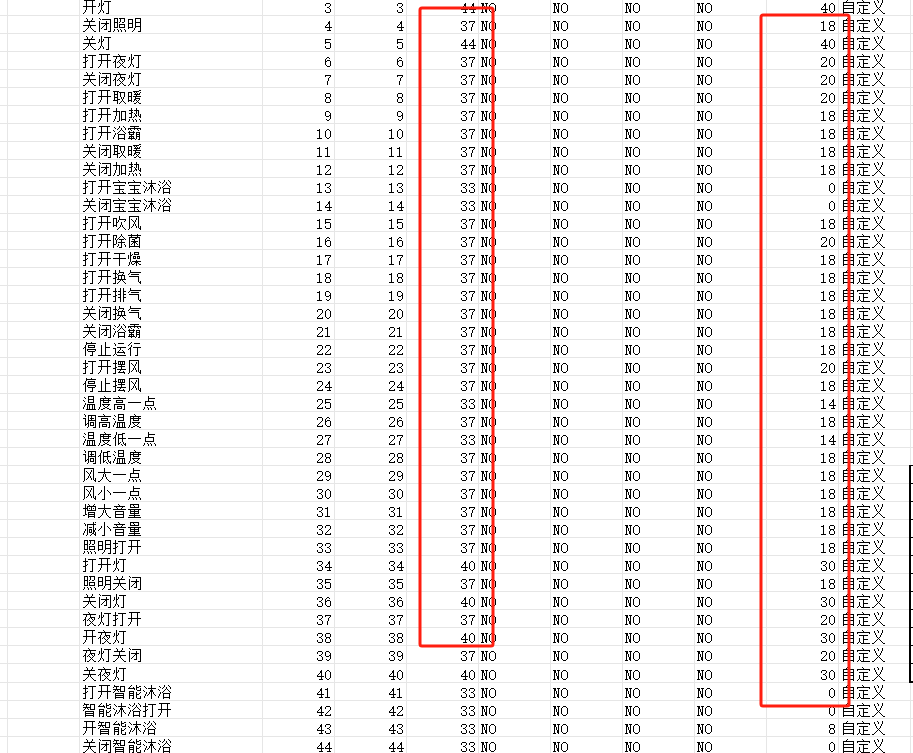 The ninth column in the table is the special word count. Increasing this value requires the algorithm to exceed the confidence threshold more times for the preceding command words, which helps reduce misrecognition of longer commands as shorter ones. For example, to prevent “turn on the bathroom light” from being misrecognized as “turn on the light,” you would increase the special word count for “turn on the light.”