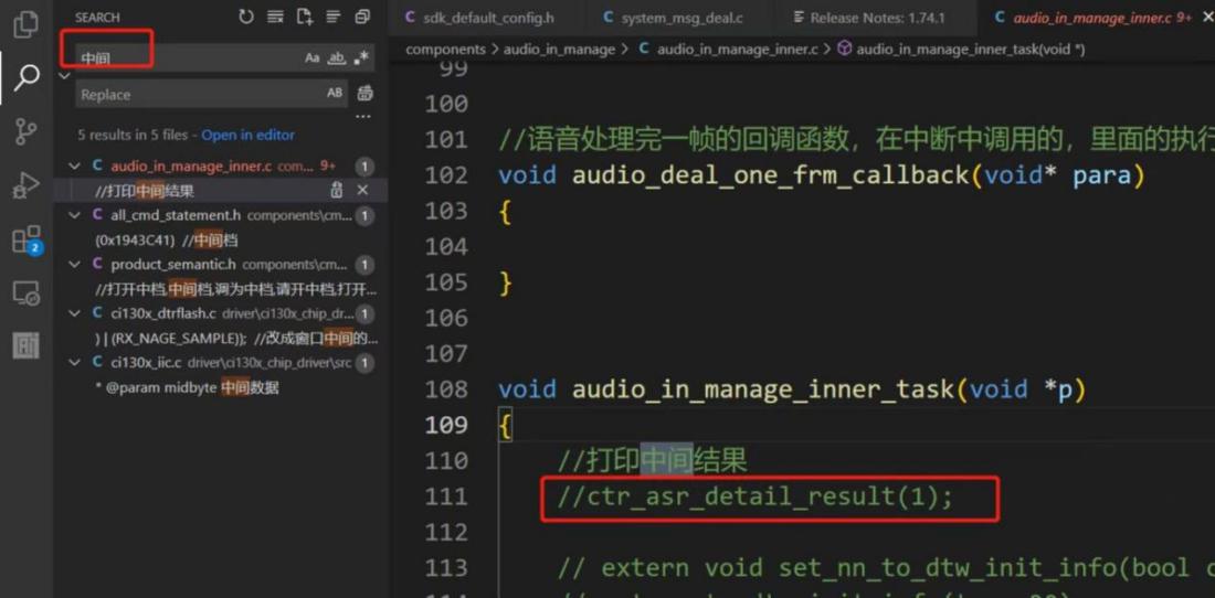 To enable the intermediate result logging function, search for “intermediate” in the top-left corner, find the relevant comments, and uncheck the default commented sections to enable output. The log will display recognition scores and related result words during recognition, helping you adjust word segmentation based on the output.