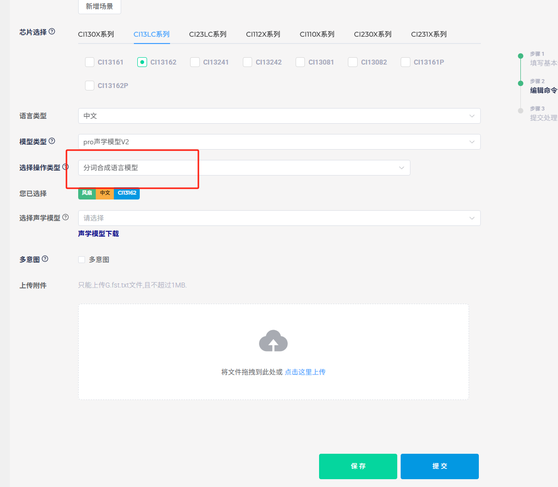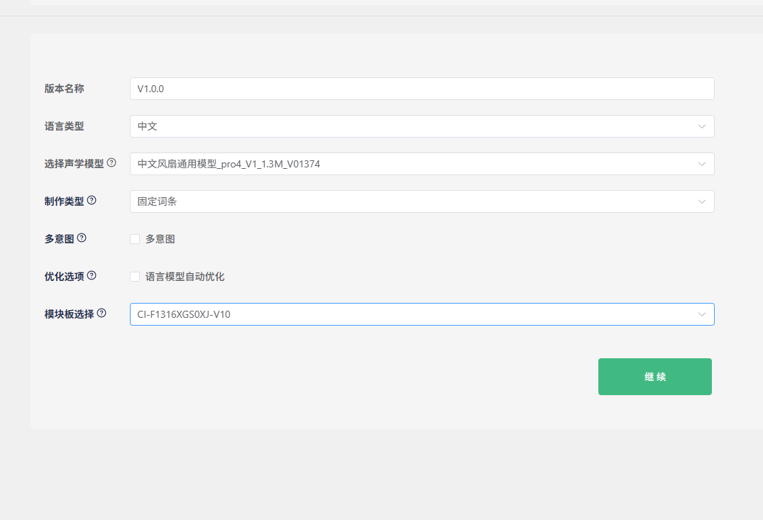 Keep the default “Version Name”. For “Language Type”, we’ll use Chinese as an example. “Select Acoustic Model” is crucial as it affects the noise reduction performance and the sensitivity to command words in real-world environments. Generally, newer and larger models perform better. In the example above, “pro4” is the model version (currently the latest), “1.3M” is the model size (the maximum size that the 13162 chip can accommodate), and “1374” is the model ID for differentiation. For “Creation Type”, you can choose between fixed phrases and natural speech - we’ll demonstrate with fixed phrases here. The “Optimization Options” are selected by default. If you plan to create natural speech or commands in other languages later, you can uncheck this to speed up SDK generation.