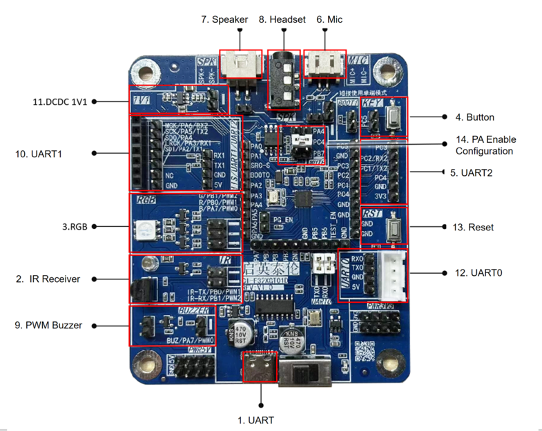| 14 | Reset button | \ | Press to reset the chip, can be used for program debugging or firmware download |