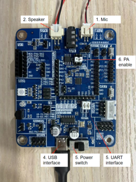Connect the development board as shown below, turn on the power (the switch position near the USB port is ON), and you will hear the standard firmware voice prompts.