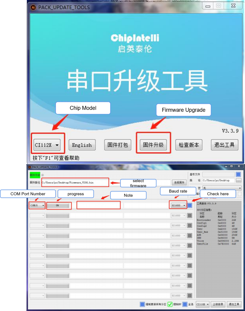 - Open the firmware programming tool (the tool can be found in the CI13LC_SDK\tools directory of the SDK development package, named PACK_UPDATE_TOOL.exe). Select the corresponding model based on the chip, click the firmware update button, select the firmware file that has been made, and find the serial port number allocated to the USB to serial debug tool on the computer. After preparation is complete, power cycle the board to enter programming mode, then you can download the firmware. If the USB-to-UART adapter is not recognized by the computer, please install the appropriate drivers.