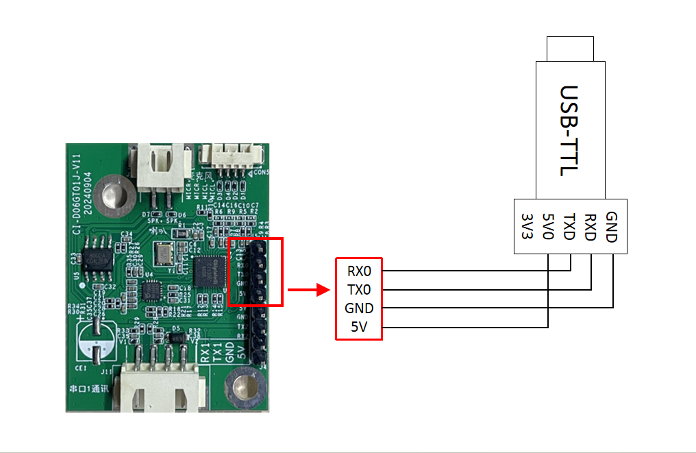 Using the USB-to-UART tool shown above as an example, before programming, connect the tool’s power, ground, and TX/RX pins to the corresponding module pins (note that the tool’s RXD and TXD correspond to the module’s TX0 and RX0). The connection method is shown below.