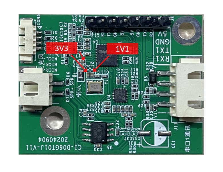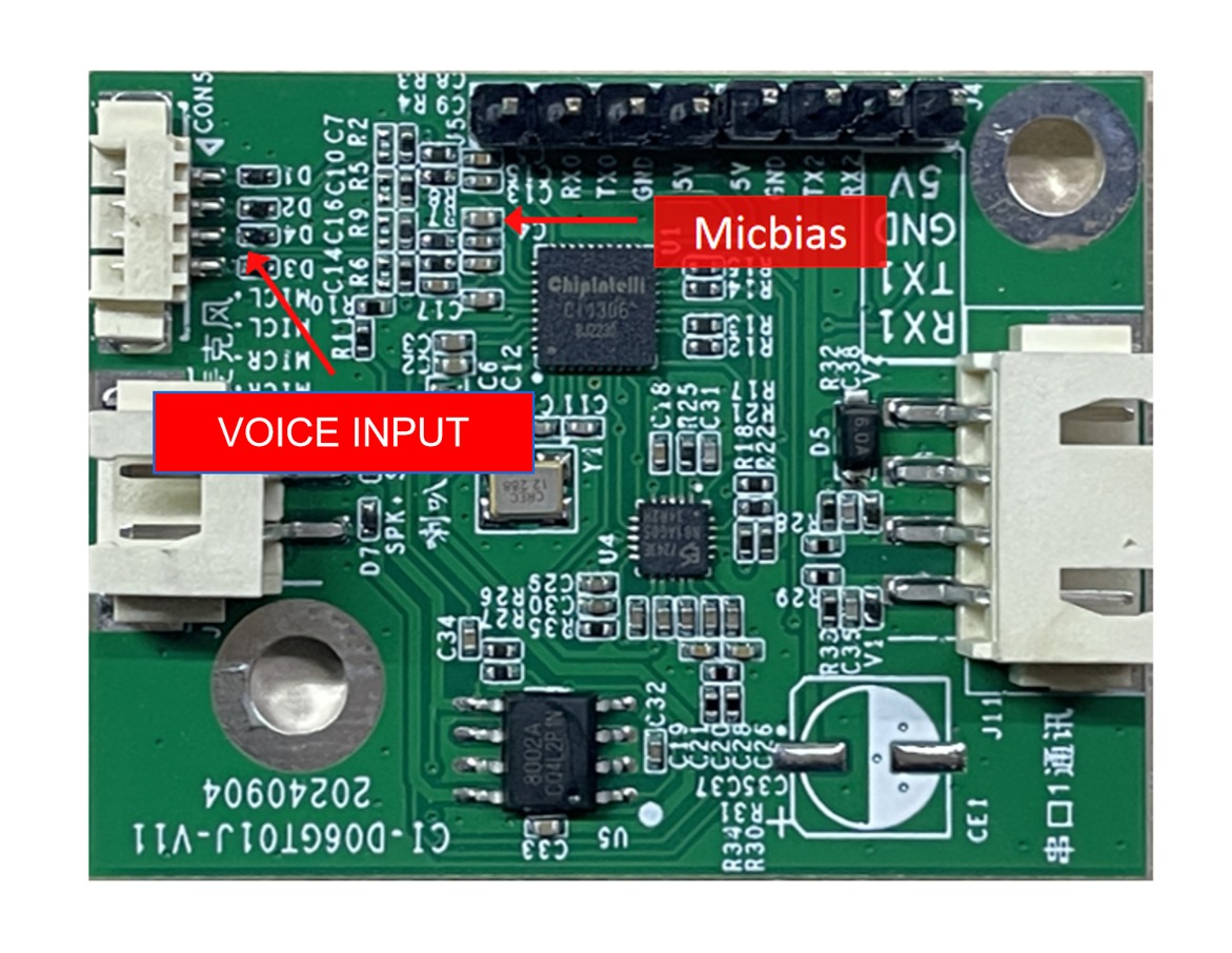 - Use a multimeter to measure whether the MICBIAS pin of the main chip is around 2.8 V, and use an oscilloscope to check whether there is an input voice waveform at the microphone input pin (set 100 mV per division). If the signal is normal, consider firmware issues; if abnormal, inspect the board hardware for physical damage. The measurement point is shown below. If all checks are normal, contact our technical support team.