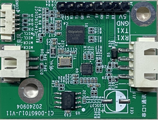 This module is a general-purpose, portable, low-power, high-performance voice recognition module developed for low-cost offline voice applications. The model is CI-D06GT01J, with CI1306 as the main chip, supporting recognition of up to 500 offline command words.