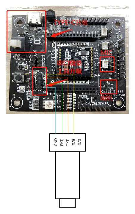 - Use a multimeter to measure whether the MICBIAS pin corresponding to the main chip is about 2.8V, and use an oscilloscope to measure whether the microphone input pin has an input voice waveform (the voltage of each oscilloscope cell is adjusted to the 100mv gear). If the signal is normal, consider whether the firmware is correct, and if the signal is abnormal, observe whether the board hardware has physical damage. The measuring points are shown in the figure below. If there is no problem in the above inspection, please contact our technical support personnel for help.