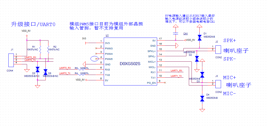 When designing the baseboard or host motherboard, a capacitor of no less than 100μF should be placed at the module’s 5V power input. Microphone signal traces should be kept as short as possible and properly shielded. Speaker (SPK) traces should also be short and wide, and the routing area should be kept clear of any crossing signals.
