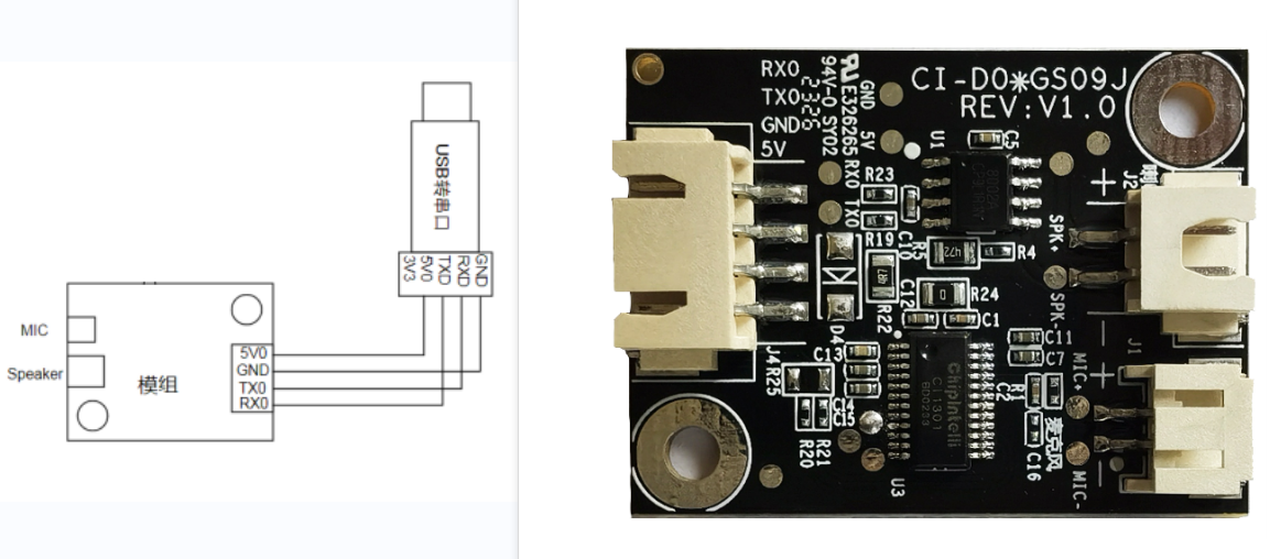 When using the module, pay attention to connect the microphone, speaker, and power/serial ports correctly. Take precautions to prevent short circuits at the test points on the back of the module.