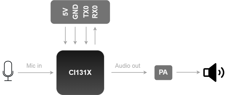 Using this module requires designing a debug baseboard or host mainboard. The main purpose of the debug baseboard is to carry this module, provide power, place microphone and speaker sockets, and implement communication circuits with the main controller. 1. It is recommended to place a larger-value filter capacitor at the module power input to ensure stability of the 5 V input. If the 5 V input ripple is small and noise is low, this may be omitted.